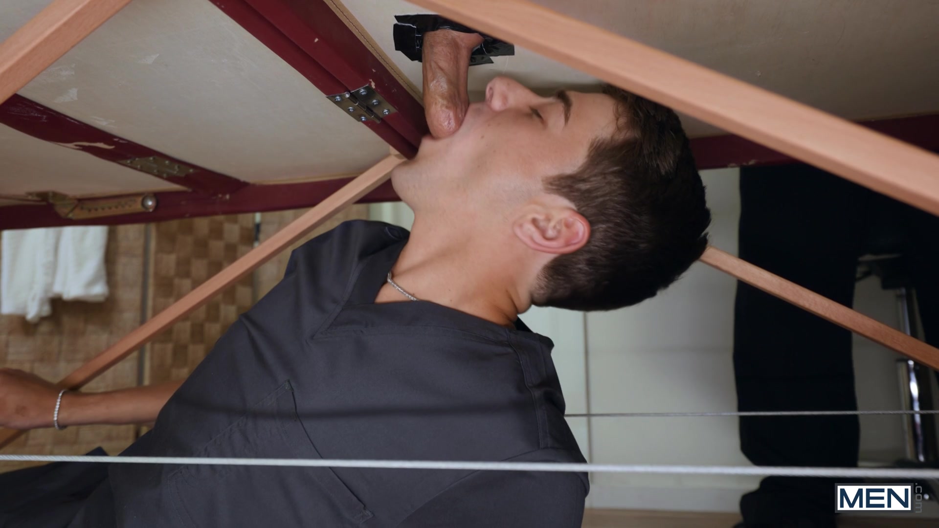 Les esthéticiens Joey Mills et Big Dick Fig prennent grand soin de leur client sexy Dom King lorsqu'il arrive pour son soin du visage à quatre mains. Ils lui demandent de se changer et de s'envelopper dans une serviette, jetant un coup d'œil à son cul sexy et à sa grosse bite, puis commencent par un massage. Pendant que Fig huile le cul et les jambes de Dom, Joey se glisse sous la table et lui suce la bite. Puis vient le moment du soin du visage, et Joey baise la bouche de Dom et s'assoit sur son visage, puis chevauche sa bite pendant que Fig baise les pieds de Dom. Les actifs double pénètrent le minet Joey, puis le prennent en sandwich.
